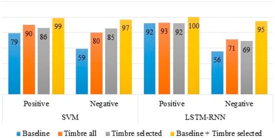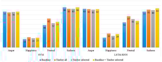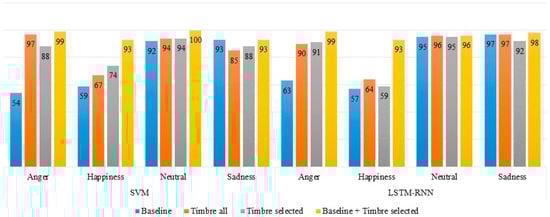 Figure 4 shows the recognition rates of positive and negative emotions obtained using all feature sets for binary classification. The recognition rates of both positive and negative emotions improved for the combination of the baseline and timbre selected feature set compared to the rest of feature sets on both SVM and LSTM-RNN. Figure 5 shows the recognition rates of discrete emotions obtained using SVM and LSTM-RNN for different acoustic feature sets. It is clear from Figure 5 that the recognition rates for all emotions were significantly better for the combination of the baseline and timbre selected acoustic feature sets compared to the recognition rates for the rest of the acoustic feature sets. The recognition rates for angry and happy emotions increased substantially for the timbre all acoustic feature set, but the changes in the results for neutral and sad emotions were not significant. Timbre features improved the discrimination of emotions that have the same level of pitch and loudness. Baseline acoustic features can discriminate emotions when the acoustic features of emotions in speech, such as pitch and loudness, are different. In Table 6, comparison of the results in the literature with a proposed feature set was given for EMO-DB. From Table 6, it can be seen that the proposed feature set increased recognition accuracy for both the discrete emotions classification and the binary valence classification.