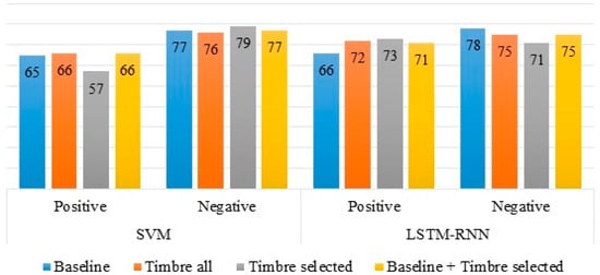 The results on IEMOCAP were different from EMO-DB. As can be seen from Table 5, the highest recognition rates for binary valence classification (74%) and the classification of discrete emotions (65.06%) were achieved using the timbre all acoustic feature set. The results obtained using the timbre selected acoustic feature set were higher than the baseline feature set and close to the timbre all feature set. Although the recognition rates on a combination of the baseline and the timbre selected feature set were better than the baseline feature set, they were lower than the results on the timbre all feature set. The baseline and timbre selected feature sets complemented each other on the IEMOCAP database. Figure 6 shows the recognition rates of positive and negative emotions achieved using the baseline, timbre all, timbre selected, and the combination of baseline and timbre selected feature sets for binary valence classification.