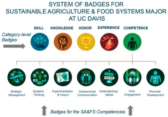 In the 21st century, we need new talents with various practical skills. For example, the establishment of a life sciences, economics, and humanities course, which enables students to experience on-site learning by combining eight different departments, can create talent required to develop a sustainable agriculture and food system. The new curriculum should be run mainly on the basis internships or field practice outside the classroom. One of the methods designed to allow students to express themselves differently is the ‘digital badge’ system. The core competencies required for college graduates are ‘systematic thinking’, ‘experiment and questionability’, ‘value comprehension’, ‘human communication ability’, ‘strategic management ability’, ‘citizen participation ability’, and ‘development ability‘. These core competencies are expressed as a ‘digital badge’ in U.C. Davis’s Digital Badge [17,18], and each competency is divided into five stages: skill, knowledge, honor, experience, and competence. As shown in Figure 3, the ‘digital badge’ system is an evaluation criterion for human capital that verifies widely and accurately the adequacy of the necessary capabilities in the mobile connected society.