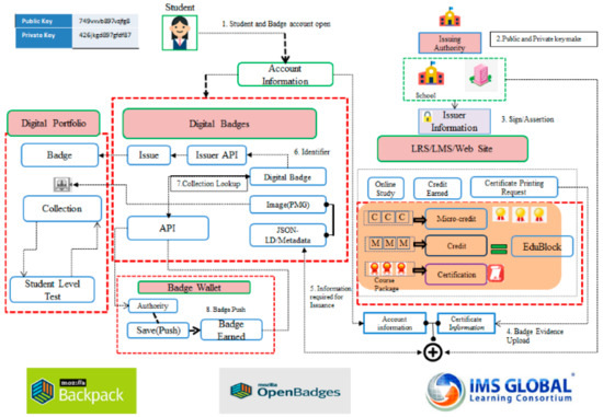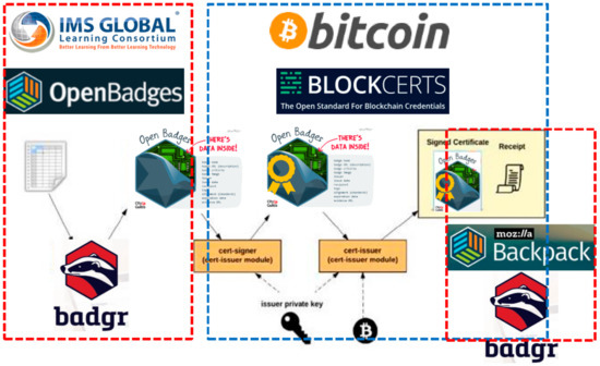 Blockchain technology is used as the base technology in many fields because it uses a distributed, decentralized database without any central control over the system and is highly secure owing to the use of the SHA 256 algorithm [1]. A survey conducted by the World Economic Forum in 2015 found that those polled believe that there will be a tipping point for government use of blockchain by 2023 [2]. Governments, large banks, software vendors, and companies involved in stock exchanges, especially the Nasdaq stock exchange, are investing heavily in this area. For example, the UK Government recently announced that it is investing £10 million for blockchain research [3] and Santander has identified 20–25 internal use cases for technology that can predict a reduction in banks’ infrastructure costs by up to £12.8 billion a year [4]. To understand the relevance of blockchain in the education system, it is important to understand its components and implementation on educational networks. Blockchain is a distributed record of digital events that are linked together to maintain the link and hash values of previous events [5]. In this way, all the events are liked with the chain and stored on each computer in the same network. Everyone can see the events, but no one can change the information, not even the owner of the event. Public blockchains are accessible to everyone and have the potential to add new blocks to the chain, whereas private blockchains are used by organizations. The best known blockchain is the one at the heart of the Bitcoin system of digital money [6]. “Proof of work” is an important feature of the blockchain technology, where a new block is checked for legitimacy and is added to the chain of blocks. This is done using special notes for the benefit of incentives. This is a verification process, which is also called as mining, and in an education system, the badges are verified using the mining method. It is nearly impossible for any hacker to hack a blockchain, and this makes the Bitcoin blockchain a highly trusted platform [7,8]. Mining requires considerable amount of power and electricity, and even if a hacker has all these things, he/she will still need to spend a considerable amount of time on the network.