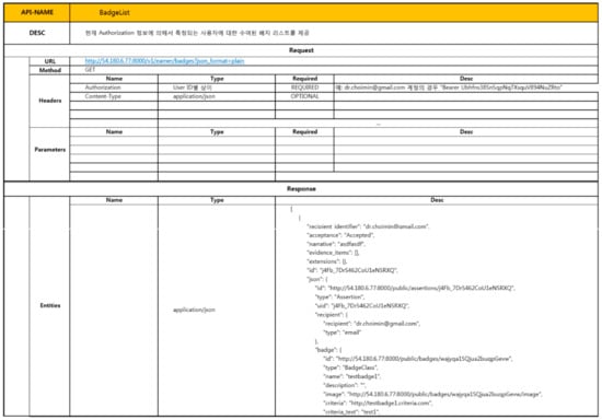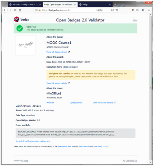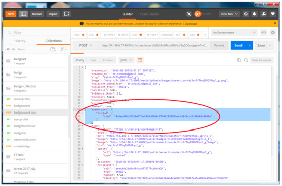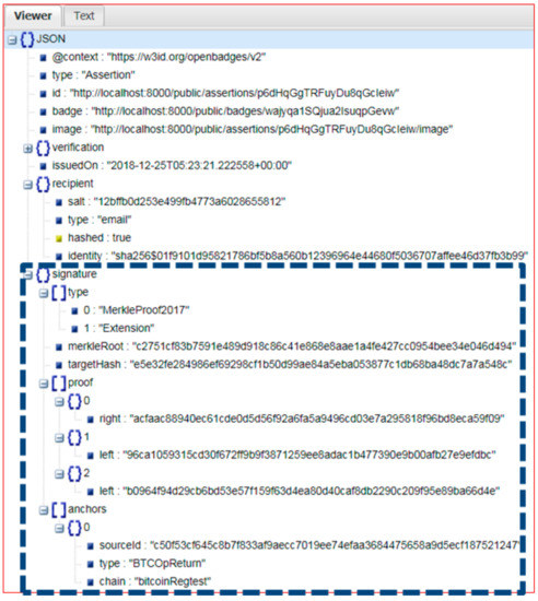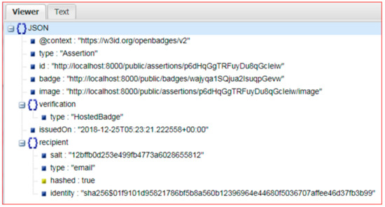 Now, we describe the details of the digital badge platform based on blockchain. Originally, the Badgr platform itself did not support blockchain. Therefore, in this study, we have implemented an upgraded digital badge platform to operate in conjunction with the blockchain. The issuing and backpack management system can create, issue, and manage badges conforming to the OpenBadge specification. Therefore, in this study, a block badge-based digital badge issuance and backpack management system was implemented in conjunction with block chain support [24], and the block badge-based digital badge issuance and backpack management system, which was originally aimed at, was constructed. The digital badge assertion information, which is issued by the digital badge management system, is displayed through the JSON viewer as shown in Figure 6. The information within the assertion are as follows.