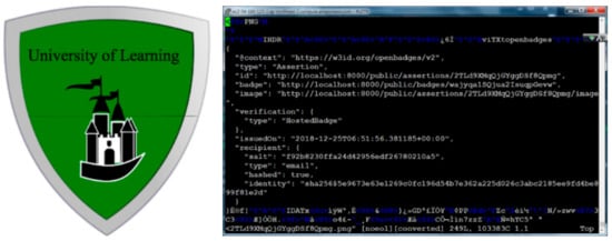 Published digital badges are available in two types (JSON or PNG): The first is the previous assertion/JSON format, in which the information of the badge is expressed in the form of text and URL. The second format is in the form of a PNG image file containing the information of the badge [25]. The image file is a normal PNG file, as shown in the figure above. The badge assertion information is baked inside the PNG file by the iTxt format of the png file. In this work, we utilize both types of badges at the same time. The badge baking is the process of embedding the assertion into the badge image. We can simply say “attaching information with the image”, but the difference is that the associated information is always attached with the image and is compatible on many platforms. Our platform bakes the information of “id”, “image”, and “recipient” to the digital badges. The iTxt chunk provides support for international text, and is represented using the UTF-8 encoding of UCS. The badge image is in PNG (Portable Network Graphics) format; therefore, the information associated with it must be compatible to the image file format. The iTxt format is compatible with the PNG encoder, and therefore baking is only possible with the iTxt format.