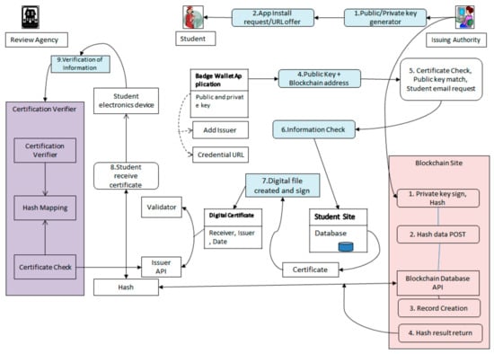 Figure 9 shows the flow chart of the platform operation developed in this study. As shown in the figure, the digital badges and certifications are issued by the issuing authority to the student, and they are also recorded by the issuing authority to generate blockchain transactions. Backpack is a badge repository, the original concept of which was proposed by Mozilla. Digital badges and certifications are verified by the certification verifier on the Bitcoin blockchain in regression test mode or the Ropsten Ethereum network [26]. The regression test mode of Bitcoin is used to establish a new blockchain with private control but has the same rules as the public Bitcoin network. This mode is specially used for research and development purposes, where the rules are predefined. Any individual or organization can create an Issuer profile and begin defining and issuing digital badges. Any entity that can be described with a name, description, URL, image, and email address is a possible candidate to become an Issuer. To issue a digital badge, we need a technology platform that is compatible with the Open Badges specification [12].