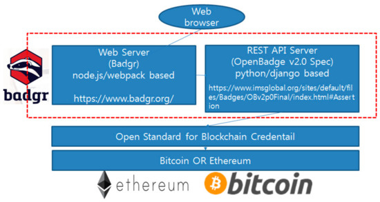A blockchain is formed by linking many blocks together, and each block can hold nearly 1 Mb of data in it. In the Bitcoin network, the blocks contain the timestamp, transactions, and hash of the previous block; however, in our educational network, the blocks contain course credit, assignment, skills, etc. Every student and teacher can see the skills of the student, but they cannot make any changes. The students are able to show their skills by referencing backpack websites containing all the acquired badges. The badges are compatible with most of the internet platforms and can be shared over the internet or social media. IMS Global provides the certification of badges and OpenBadges provides the configuration of the badges. In this research, the issuance of badges and verification is done using the Badgr [9] platform. Originally, a badge in the Badgr platform is only a trust relationship between two parties. This means that so far we have not been able to create chains of trust and networks of trust. However, in this study, we extended and implemented the trust relationship among all participants in the distributed environment of blockchain with regard to the following concerns. (1) Elimination of the inefficiency and social cost problems of various certificate issuing systems: There are some inefficiencies and inconveniences in the certificate issuing systems of educational and public institutions, provided through the existing information system. There are costs related to the issuance of certificates, transcripts, and diplomas for online and offline education and training courses. In order to resolve these problems, we provide a technique for the certification creating/issuing/awarding system by using simple REST (Representational State Transfer) APIs (Application Programming Interfaces) [10]. (2) Difficulties in managing subdivided qualifications: Our system can be easily extended to establish a management system capable of coping with segmentation and short learning contents such as microlearning. We focus on the issuance and management of competency unit certificates as an authentication method for detailed educational and training courses. (3) Establishment of an effective management system for individual education and training history of learners: We established a backpack system to gather and manage the experiences and achievements in official and informal activities obtained from individual and offline education and training. In this way, our system can establish a system to officially certify the collected information, so that the information can be used for future learning and career planning.