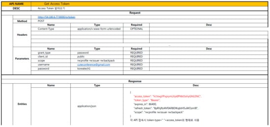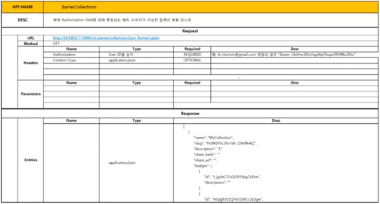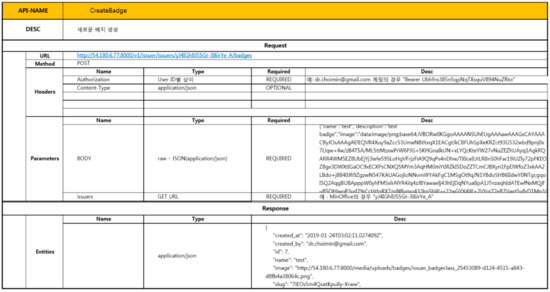 As shown in Figure 19, we call the badge by issuing the REST API with POSTMAN, and the blockchain transaction ID in the extensions field is 0x98c400... txid. When calling the REST API, we need to list some arguments as headers. The first is the authorization key required for OAuth2 authentication. The second is the setting of the content type. The authorization key is issued through OAuth2 and is a valid key value only for a certain period of time. It is compatible with OAuth2; therefore, the user can log in using the login account and password of another system that uses Oauth2 (Twitter, Facebook, etc.) [27].