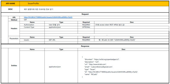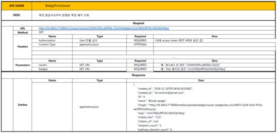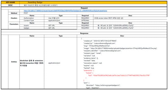 In this research, we implemented a digital badge issuance and backpack management platform with blockchain (Ethereum and Bitcoin) support. It enables digital badge issuance in conjunction with blockchain by using a badge issue API. After badge award, our system provides a transaction ID value (within a field named as txid) in the response of the badge issuing API (JSON—extensions field) as extensions field. Figure 11, Figure 12, Figure 13, Figure 14, Figure 15, Figure 16, Figure 17 and Figure 18 show the REST APIs in detail.