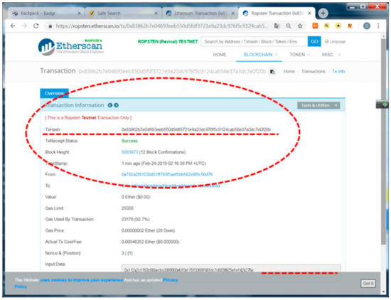 We implemented a blockchain platform to record the history of digital badges. Therefore, we can query the blockchain transaction history by using etherscan.io after issuing the badge. We can see the image shown in Figure 22 when we search a transaction with txhash value after a block time. The block time is ~12.6 s: it is the mean time required to propagate a new block across a vast majority of nodes in a P2P network. An Ethereum transaction is recorded into Ethereum’s blockchain faster than a Bitcoin transaction would be recorded into Bitcoin’s blockchain. (Bitcoin’s block time is roughly 10 min)