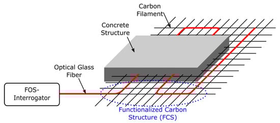 Figure 1 depicts the experimental concept of embedding the FCS in concrete for its SHM, as evaluated in the work presented herewith.