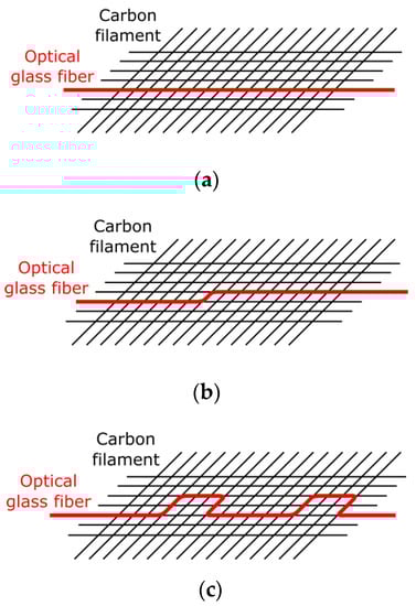 2D-FCSs with different optical fiber sensor configurations. Straight (a), with an offset (b) and meander (c) fiber configurations were applied to investigate the bond between optical fiber and the carbon filament.