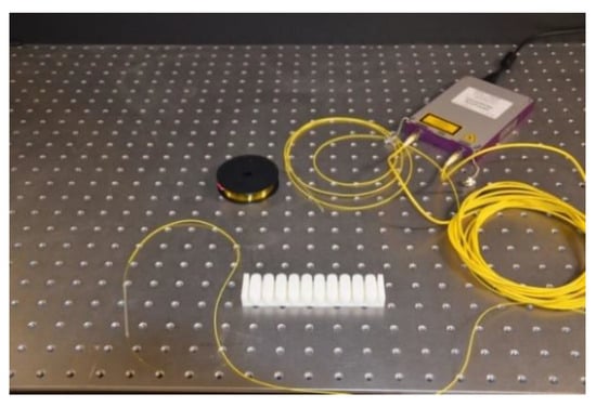 In Equation (1), , and are the refractive index of the fiber core, the central wavelength of the light source, and spectral difference between two adjacent maximums of the measured transmission spectrum of the Mach-Zehnder interferometer, respectively. The refractive index value for the fiber core was taken as 1.45.