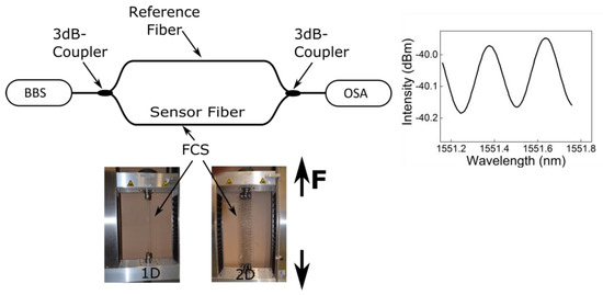 In order to investigate the sensor response of the FCS a fiber optic Mach-Zehnder (MZ) interferometer was applied []. The previously developed fiber optic MZ interferometer enables the investigation of the force transfer between the FCS and the optical glass fiber (fiber optic sensors) and thus the characterization of the bond between these two elements of the FCS. As illustrated in Figure 4, the applied fiber optic MZ interferometer consists of a broadband light source (BBS) (Opto-Link C-Band ASE), two fiber optic 3 dB couplers, two fiber arms, and a spectrometer (OSA) (Ando AQ6317B). The fiber optic MZ interferometer was set-up with only SM fiber components and all fiber components were spliced together. Moreover, the FCS was spliced to one arm of the developed interferometer in order to determine the strain transfer between the optical fiber and the FCS. When force is applied to the FCS using the tensile testing machine, the related length change of the optical fiber of the FCS causes a phase difference (Δφ) between the light (of wavelength λ) travelling in both fiber arms. This in turn results in a change of the interference pattern (displayed in the subset of Figure 4) from which the length change ΔL of the optical fiber inside the FCS can be determined as follows: