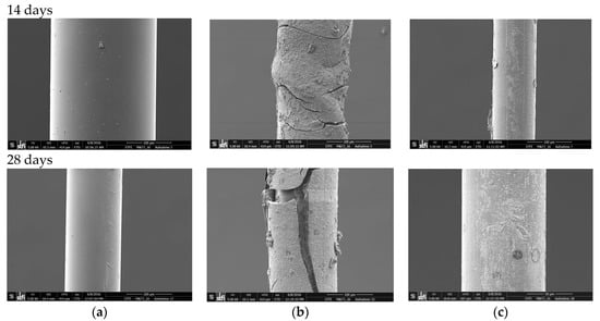Scanning electron microscope (SEM) images of the optical glass fiber with acrylate (a), polyimide (b), and carbon/polyimide (c) coatings after 14- and 28-days of alkaline attack, respectively.
