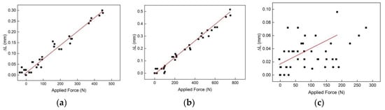 In Figure 6, the sensor response of the FCSs with different optical fiber configurations are illustrated (for all three different fiber configurations the Corning CC was applied). Before the measurements were performed, the FCS samples were strained to a force of 40 N and the maximum applied strain was 2.4 mɛ during the tests. In case of configuration one (straight arrangement, Figure 6a) and two (offset arrangement, Figure 6b), a linear response to an applied force of 6.4 × 10−4 mm/N (R2 = 0.96) and 6.7 × 10−4 mm/N (R2 = 0.99), respectively, with a relatively low hysteresis of 4.4 × 10−5 mm/N and 1.9 × 10−5 mm/N, respectively, were obtained. In case of the third configuration (meander arrangement, Figure 6c), no correlation between the applied force and the length change of the optical fiber of the FCS could be observed (R2 = 0.25). The obtained result for configuration three suggests that due to the meander shape and thus due to the periodic spatial variation of the optical fiber inside the FCS, the bond between the optical fiber and the carbon filament is less strong (less bonding length) and thus the FCS is less sensitive to applied force. Therefore, the obtained results (from the three different fiber configurations) suggest that for sufficient sensor sensitivity, the bonding length between the optical fiber and the carbon filament to be at least ≥150 mm long (compare configuration two).
