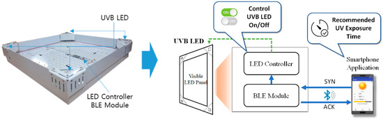 The UVB LED general lighting system proposed in this paper is comprised of an IoT smart device, a smartphone, and UVB LED general lighting as shown in Figure 2. The IoT UV measuring device was constructed with a UVI sensor that measures real-time UVI outdoors, an Arduino-based microcontroller (MCU) that performs UVI calculation and communication functions, and a BLE module that sends the measured UVI information to the smartphone. The smartphone application was used to calculate the daily cumulative UV dose of the user, the estimated vitamin D synthesis amount, and the control time calculation of the UVB LED lighting to meet the insufficient amount of UV dose. In addition, a setting function was used to set the user’s information so that the optimal UV dose required for a day according to the ages of the users can be calculated differentially. Furthermore, a visualized service was implemented to provide users with the communication function for data sending and receiving between the IoT UV smart device and UVB LED lighting, as well as UV and vitamin D related information. The UVB LED general lighting was constructed with the UVB LED, visible LED, and BLE module. In addition, a UVB LED lighting module was implemented to perform a communication function to receive the lighting control information from the smartphone and to operate a UVB LED lighting module based on the received information so that the UVB lighting service can be executed indoors.