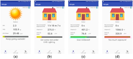 In the smartphone application, a communication function for data transmission between IoT UV device and UVB LED general lighting and a setting module for entering user’s age was implemented. In addition, the smartphone application was made to provide the information on UV and the estimated vitamin D synthetic amount to the users. In order to promote the safe use of UVB LED lighting and to avoid overexposure to UV, an alarm function was provided when the minimum EUV dose (MED), which is the EUV dose causing skin erythema, was exceeded. MED was set to 250–350 J/m2 for skin type II and 300–500 J/m2 for skin type III [22]. Furthermore, the IoT UV device and UVB LED, the communication module for sending and receiving data between indoor and outdoor lighting and the setting module for inputting user’s age information, respectively, were also implemented. For the communication protocol for the jobs, BLE was used and it was always connected with the IoT UV measuring device. Indoors and outdoors could be distinguished by sensing the presence of UVB LED general lighting through BLE scanning. The scanning by the BLE device was continuously performed and if UVB LED lighting was sensed, it was considered that the user entered the room. A connection between the smartphone and UVB LED lighting was also established. Figure 5 shows an example of the notification function of an Android OS based mobile app that implements the daily UV dose calculation function. Figure 5a shows the screen that provides UVI information which is received from the IoT UV measuring device and the Erythemal UV Dose (EUD) calculated based on that information. In addition, Figure 5b shows the values of control time of UVB LED general lighting according to the satisfaction of the daily optimal UVB dose when the user is situated indoors. Information on the amount of estimated amount of vitamin D synthesis to date and information on vitamin D producing UV radiation (Vitamin D UV Dose, VUD) being cumulated by UVB LED general lighting is also displayed. Figure 5c shows the results when the daily recommended vitamin D UV dose (RVUD) is satisfactory through exposure to the sunlight and indoor UVB LED lighting. Figure 5d shows an example of the alarm function provided when the EUD in and out of the room exceeds MED.