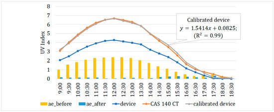 IoT UV measurement devices using UVI sensors must be calibrated through comparative experiments with the reference equipment. Their performances can be improved by applying the correction formula that reflects regional characteristics and seasonal characteristics [16]. For the calibration and performance evaluation of the IoT UV measuring device, UVI from the noon (12 p.m.) until the sunset on 21 February 2019 at the latitude of 36.85 and the longitude of 127.15 (Kongju National University, Korea) was used. A spectrometer (CAS 140 CT-152, Instrument Systems, Munich, Germany) was used as a reference device for the calibration and performance evaluation of the measuring instrument. In addition, a tracking system that follows the sun in the vertical direction by calculating the azimuth and altitude of the sun based on the latitude, longitude, and date of the current location was installed. The correction formula by linear regression analysis was derived based on the UVI value acquired through the IoT UV measurement device and the reference device at the same time for the natural light. The correction formula was applied to the IoT UV measurement device. Figure 7 shows the experimental results of the reference device for the sunlight and the IoT UV measuring device. The measurement results of the IoT UV device are displayed before and after calibration together. The mean absolute percentage error (MAPE) of the data measured by the spectrometer and the IoT UV measurement device before calibration was 45.5%, but after applying the calibration formula, the MAPE could be decreased to about 11.1%.
