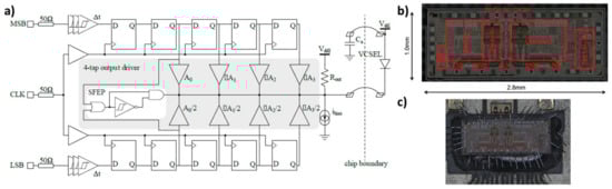 The single-channel block diagram of the PAM-4 VCSEL driver is shown Figure 2.a and is thoroughly described in [31]. It comprised a four-tap symbol-spaced feed-forward equalizer (FFE) and a selective falling-edge pre-emphasis (SFEP). The equalizer’s taps were independently controlled, which allowed the driver to be optimally configured according to the specific transmission scenario, whereas the SFEP module was used to reduce the effect of pulse width distortion on the generated PAM-4 signal. The VCSEL driver chip was fabricated in 130 nm SiGe BiCMOS technology and exhibited a footprint of 1 × 2.8 mm. The transmitter board comprised a two-channel VCSEL driver and a respective array of single-mode VCSELs described in Section 2.1.1. Initially, the development of a four-channel VCSEL driver was targeted but the mismatch between the channel width of the VCSEL driver (>1 mm due to the on-chip PAM-4 generation and equalization) and the cathode pitch of the VCSELs (350 μm) prohibited such a design. The limitation in the channel pitch of the VCSEL driver mainly derived from the bond pad spacing of its data inputs (MSB (most significant Bit) and LSB (least significant Bit)). The assembly rested on a PCB (Printed Circuit Board), designed to simultaneously drive two VCSEL driver chips. To reduce the parasitic inductance between the VCSEL and the driver, the VCSEL anode voltage was supplied by the driver chip. A second technique used to reduce the parasitic inductance was to place the decoupling capacitors directly underneath the VCSELs, omitting additional bond wires, while using the thickness of the capacitors to put the VCSEL and driver surface at the same height.