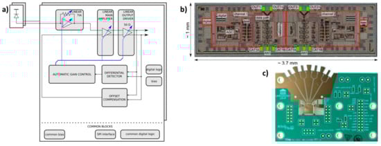 (a) Block diagram of a 2 × 1 TIA array, (b) micrograph of the TIA array die, (c) dual-channel receiver board.