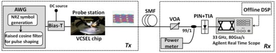 The single-ended output of an 8 bit, 65 GSa/s keysight arbitrary waveform generator (AWG) was used to generate the respective PAM-4 electrical test signals with a repeating pattern length of 210 symbols. Digital pulse shaping was implemented by exploiting a raised cosine (RC) filter with a roll-off factor of a = 1 to restrict the bandwidth of the transmitted signal to the main lobe. A high-precision voltage source was used to drive the VCSEL above its lasing threshold. The generated electrical PAM-4 signal, with a voltage swing of 550 mVP-P, was superimposed on the DC signal by means of a Bias-T and modulated the VCSEL directly, which resulted in a generated optical PAM-4 signal that exhibited 1.5 dBm output optical power. The light from the VCSEL was coupled to a cleaved standard single-mode fiber (SSMF) using a vertical-probing arrangement and was fed to an off-the-shelf, limiting 40 Gb/s photoreceiver, with a 35 GHz 3-dB bandwidth, a 0.6 A/W responsivity, and a 500 V/W conversion gain. A variable optical attenuator (VOA) was used to adjust the launched optical power in the receiver for bit error rate (BER) measurements. Alternatively, a spool of 500 m of the standard single-mode fiber (SMF) was utilized to evaluate the received optical signals in a transmission scenario.