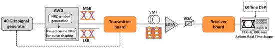 Two single-ended outputs of an 8 bit, 65 GSa/s keysight AWG with a repeating pattern length of 29 − 1 symbols generated two identical NRZ electrical signals of 500 mV peak-to-peak to feed the respective MSB and LSB AC-coupled inputs of the VCSEL board. To decorrelate the NRZ tributaries used for generating PAM-4, a delay difference of 10 bits was introduced between the two AWG outputs. The baud rate was varied to investigate the link’s performance under different data transmission scenarios. Pulse shaping to restrict the bandwidth of the baseband signal was performed by implementing a raised cosine electrical filter with a roll-off factor of a = 1. A 40 GHz Anritsu signal generator phase locked to the AWG provided the full-rate clock reference for the transmitter board. The generated PAM-4 optical signal was transmitted through a 500 m and 2 km link of SSMF to the linear receiver board. To investigate the dependence of the BER to the incident optical power in the linear receiver, an erbium-doped fiber amplifier (EDFA) with a 28 dB gain, a 13 dBm saturated output power, and a noise figure of approximately 3.8 dB was employed along with a variable optical attenuator (VOA). The BER assessment was performed by exploiting the equipment Infiniium DSO-X 93304 real-time oscilloscope (Keysight Technologies, Santa Rosa, CA, USA) and the offline processing is described in Section 2.2.1.