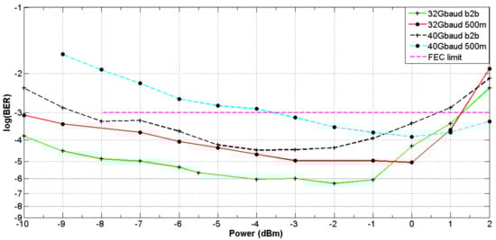 Bit error rate (BER) curves at 32 and 40 Gbaud in back-to-back configuration and after propagation over 500 m.