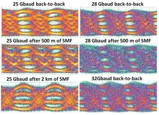 The acquired PAM-4 optical eye diagrams for different transmission speeds and distances are shown Figure 8. The diagrams were captured by a 70 GHz equivalent time oscilloscope. As expected, the eye diagrams exhibit better eye opening for lower baud rates. Moreover, propagation through the SSMF, especially in the case of a reach of 2 km, introduces degradation to the eye diagram of the multi-level signal as a result of fiber dispersion at 1550 nm.