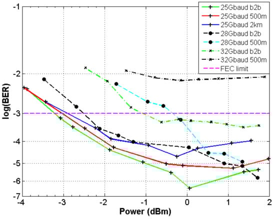 The acquired BER values at 25, 28, and 32 Gbaud for the aforementioned transmission distances were plotted against the average received optical power that was calculated from the measured photocurrent (Figure 9). The BER curves depicted by the crosses correspond to the obtained 25 Gbaud signal in back-to-back configuration and after propagation over 500 m and 2 km. Following the same rationale, the black circles and the x-marks refer to the received signals at 28 and 32 Gbaud, respectively, according to the aforementioned transmission conditions (back-to-back configuration and after transmission over 500 m). It is evident that for lower baud rates, the received PAM-4 optical signal exhibits better performance in terms of BER. It is also clear that an extension in the transmission distance leads to the degradation of the obtained BER curves. As observed for cases of 25 Gbaud and 28 Gbaud, the achieved BER values lie well below the FEC limit for all the transmission scenarios. Moreover, the respective power penalties for transmission over 500 m and 2 km SSMF at 25 Gbaud were 0.2 dB and 0.6 dB for a BER equal to 6 × 10−4. Similarly, the received 28 Gbaud signal exhibited a power penalty of 1.8 dB for a BER in the order of 5 × 10−4. Finally, in the case of 32 Gbaud, only the back-to-back configuration achieved acceptable BER values, whereas propagation through 500 m of SSMF was severely affected by the effect of chromatic dispersion and, as a result, the signal failed to reach the FEC limit.