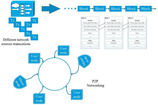 The blockchain infrastructure is usually based on a peer-to-peer interaction, wherein both network users (transactions participators) as well as the blockchain “miners” (those that enable communications with a distributed ledger) are involved. The storing of the ledger is done in a decentralized node network, which is generated via cryptographic routes that have been computed by all the miners present in the network []. Furthermore, highly reliable storage capabilities are provided by the blockchain ledger since digital signatures, consensus mechanisms, and hash chains are employed for its creation, because of such unconventional features, blockchain technology offers many facilities, including information traceability, security, and non-repudiation, while at the same time keeping all information within a public decentralized way, thus maintaining privacy []. Figure 1 depicts the blockchain structure overview.