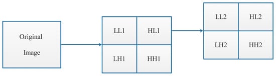 The proposed image segmentation method shown in Figure 2 was based on a previous study []. Wavelet analysis was employed for the extraction of the original image as well as data fusion. Initially, various image modalities were segmented into four different channels, i.e., low horizontal and low vertical (LL1), while the detailed images included low horizontal and high vertical (LH1), high horizontal and low vertical (HL1), and high horizontal and high vertical (HH1) frequencies. In the second stage, every channel (segment) would be sub-segmented into four new channels, namely: HL2, LL2, HH1, and LH1 []. This procedure continued for two more levels. Finally, the original image was sub-divided into small image groups as follows: