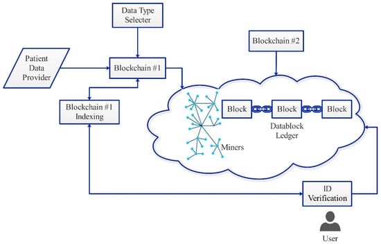 The blockchain can be explained as a scattered database, which also includes an ordered records list, which are linked via a continuous chain of blocks []. Normally, a block includes the encrypted key (hash value) of the earlier block, contributor signature, payload, and timestamp. The hash value from the earlier block imparts immutability from modification to the blockchain. The block’s payload changes with the application. For original data, it can be an address pointer or some other information or the content pertaining to the transaction. The generator and generation time pertaining to the block is demonstrated by the contributor signature and timestamp. Two important entities are involved in the blockchain network: Verifiers and miners. Miners signify the nodes that can create new blocks pertaining to the blockchain. Various scenarios can define diverse node types as miners. For instance, in the Bitcoin blockchain, the nodes showing proof of work are allocated as miners to maintain records pertaining to the transactions. The acceptance of new blocks is done only when verifiers confirm the validity of the new blocks. Mining can be defined as a set of processes involving verifying, generating, and accumulating new blocks into the blockchain. In the blockchain network, the consensus mechanism is crucial for ensuring the reliability and security of the mining processes. It helps to determine who is responsible for keeping records and how the new block’s validity can be checked. Since blockchain technology was originally employed for Bitcoin, transactions are broadly employed in the network to showcase new produced data. In our study, all transactions signify the secured indexes pertaining to the new emerging health records in the system. In general, blockchain technology can be divided into three groups: Private blockchain, permissionless blockchain (public blockchain), and consortium blockchain. In a permissionless blockchain, anybody from any part of the world can enter into the system, which allows access to data and the sending of transactions—for instance, the Bitcoin system. In a remote blockchain, the entry right is fully controlled by an organization. The management of a consortium blockchain is done by various organizations. With regards to our work, we have utilized the consortium blockchain and private blockchain in the e-Health system for managing and storing patient’s records, which aid in enhancing the diagnosis process.