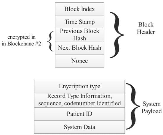 Figure 5 shows the proposed block structure. It contains two main parts: The block header and system payload. The block header consists of the block index, time stamp, previous block hash, next block hash, and nonce. The system payload consists of the encryption type, record type information, patient ID, and system data. Note that the information (of any data type) is stored inside the system data section on the system payload, and the other parts are used to form the security barrier that isolates the patient’s information. There are three entities in the system: Scheme supervisor, scheme facility providers or hospitals, and operators (patients).