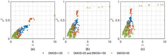 2D scatter plots between GGD parameters and of the three NFMs, where each point in the scatter plots represents one distorted image in LIVE [28] database: (a) scatter plots for the first NFM; (b) scatter plots for the second NFM; and (c) scatter plots for the third NFM.