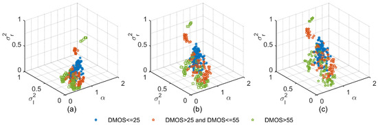 3D scatter plots between AGGD parameters , and in horizontal orientation of the three NFMs, where each point in the scatter plots represent one distorted image in LIVE [28] database: (a) scatter plots for the first NFM; (b) scatter plots for the second NFM; and (c) scatter plots for the third NFM.