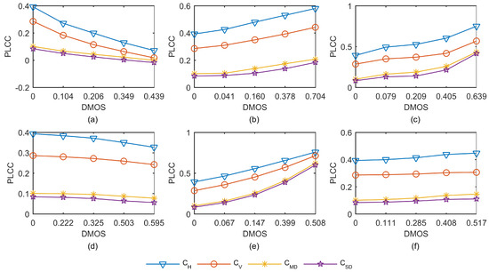The average PLCC values along four orientations for the reference images and each type of distorted images in CSIQ database [29].