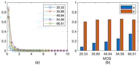 Distributions of the DFMs follow the Weibull distribution, and the distribution statistics of the DFMs increase as the MOS value grows: (a) distributions; and (b) bar plots of a and b.