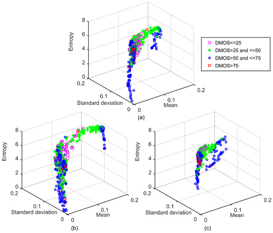 Figure 6 shows how the 3D scatter plots of the mean, the standard deviation, and the entropy of each channel in the HSV color space distributed in the feature space, where each point in the scatter plots represents one distorted image in LIVE database. We can see clearly that the distorted images belonging to different categories of DMOS values occupy different regions of the feature space, which means that the color features extracted from the HSV color space can help to distinguish images of different quality scores.