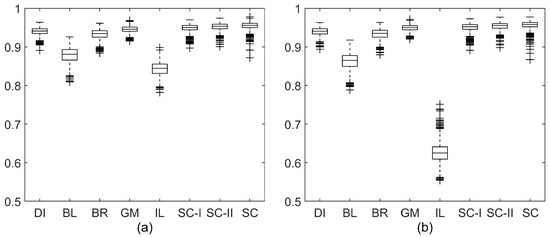 Box plots of SROCC and PLCC distributions of BLIINDS-II [13] (BL), DIIVINE [12] (DI), BRISQUE [15] (BR), GMLOG [19] (GM), BIQA-SC-I (SC-I), BIQA-SC-II (SC-II), and BIQA-SC (SC) across 1000 train-test trials on LIVE database [28]: (a) box plot of SROCC distributions; and (b) box plot of PLCC distributions.
