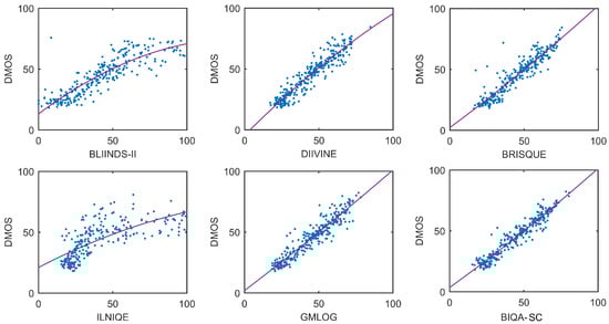 Scatter plots and fitted lines of the DMOS values versus the predicted scores by the competing algorithms on LIVE database [28].