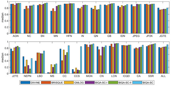 To further test the generalization ability of the proposed algorithms, we also conducted experiments on the 24 distortion types in TID2013 database. The bar plots in Figure 9 correspond to the median SROCC values of 1000 train-test trials on TID2013 database. It is clear that BIQA-SC achieved promising results on most commonly encountered distortion types. For several special distortion types, such as local block-wise distortion (LBD), contrast change (CC), change of color saturation (CCS), and comfort noise (CN), BIQA-SC still achieved satisfying results and outperformed state-of-the-art algorithms. This indicates that the proposed method is capable of evaluating the image quality for various distortion types.