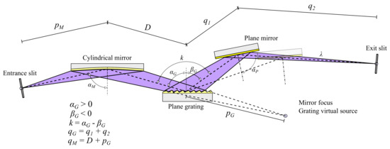 Plane grating monochromators (PGM) require a more complex optical design, i.e., the use of one or more additional mirrors [15,16]. The resolving power decreases in a slower way with the increasing energy with respect to the SGM, that is proportional to E1/2. Moreover, the subtended angle falls rapidly as the photon energy decreases, which is a required condition for maximizing the efficiency and obtaining a wide tuning of the subtended angles. Different solutions have been adopted from the original SX700 system proposed by Petersen which performs subtended-angle control and exit-slit focusing by means of, respectively, a plane mirror placed before and a focusing mirror (ideally elliptical) placed after a constant line-space (CLS) plane grating [17]. Some of them are—a CLS grating plus a rotating concave (spherical) mirror [18], a variable line-space (VLS) grating plus a fixed concave mirror [19], and a VLS grating plus a rotating–translating plane mirror [20]. The requirement of VLS gratings or elliptical mirrors, for which parameters have to be specifically conceived for the application, make these layouts unfeasible with standard optics.