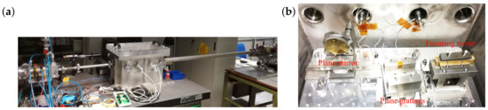 From Equation (2), the subtended angle k is calculated for each wavelength of interest and changed by translating the PM along an axis parallel to the beam output direction and rotating it around an axis passing through its center, as reported in Figure 2b. The variation of the length of due to the translation of the plane mirror, i.e., the variation of the distance between the grating and the exit slit is almost negligible at grazing incidence.