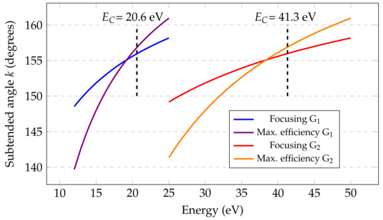 Once the geometrical design was defined, the subtended angles (reported in Figure 3) and the FWHM energy bandwidth were calculated, from Equations (2) and (6), respectively, for the entire spectral range of the two gratings.