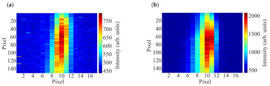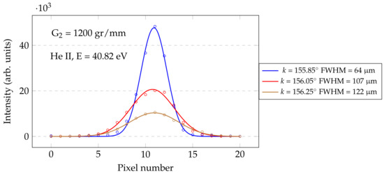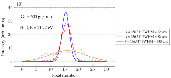 The spectral characterization of the monochromator was performed using the discrete emission lines in the 12.4–50 eV energy range of a gas-discharge lamp (filled with different noble gases—He, Ne, and Ar). A vacuum level of mbar was maintained inside the monochromator chamber, even when the gas-discharge lamp was turned on. All the measurements were performed using a cooled CCD camera detector (Princeton Instruments PIXIS) with low read-out noise ( rms), placed in the image plane, i.e., with the exit slit completely open, in a spectrometer fashion. The CCD format was pixels, with 20 m × 20 m pixel size, determining the resolution of the detection. The evaluation of the tangential defocusing aberration was performed by a Gaussian interpolation of the acquired CCD spectral image, before and after a variation of k from its nominal position (associated to a specific photon energy) of 0.2° and 0.4°. In Figure 4 and Figure 5, the emission lines of He I (1s2 → 1s2p) at 21.22 eV and He II (1s → 2p) at 40.82 eV are shown.
