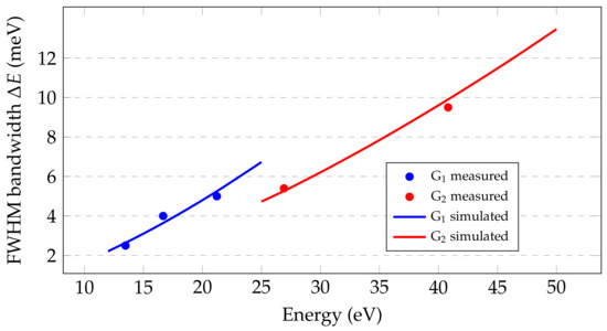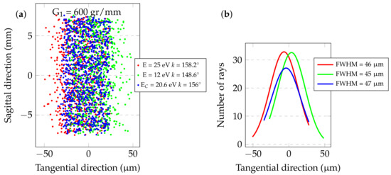 A comparison between the obtained CCD image widths in the tangential direction and the ray-tracing simulation results [23], performed with a source placed immediately before the entrance slit (assuming an angular half-divergence of 2.5 mrad × 2.5 mrad), has been performed. From Equation (5), this configuration allows for maintaining a constant value for the entrance slit magnification on the image plane within the entire spectral range. Therefore, only aberrations are responsible of a change in the image width when changing the energy. When we are not selecting , we have no defocusing, therefore the main aberration to consider is the tangential coma.