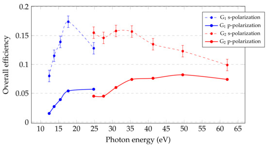The efficiencies of the optical elements of the configuration (i.e., focusing mirror, plane grating, and plane mirror) were measured in the 12–62 eV region at the Circular Polarization (CiPo) beamline at ELETTRA Synchrotron [24]. The total efficiency of the instrument, defined as the product of the grating diffraction efficiency and the mirrors reflectivity was measured. As shown in Figure 9, the efficiency of the monochromator for s-polarized light is in the 8–15% (in percentage) range. The efficiency of gratings is between 13–27%. The theoretical efficiency for p-polarized light was obtained by combining simulations with s-polarization experimental results. During the measurements, for each photon energy, the two gratings performed the spectral selection at the subtended angle k for which the tangential defocusing is corrected. In order to retrieve the efficiency, the optics were positioned on an X-ray reflectometer [25] which was installed at the output of the beamline.