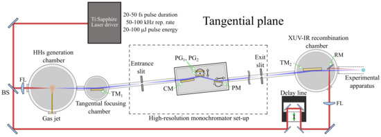 As schematized in Figure 10, the high vacuum chamber containing the entire monochromator set-up, made up of three optical elements, can be used for high-resolution applications dedicated to pump-probe IR-XUV experiments. After HHs gneration, a preliminary toroidal mirror TM1 with equal entrance and exit arms (1:1 configuration) in order to minimize aberrations, was used for the XUV-beam focusing on the entrance slit in the tangential (dispersion) direction. Similarly, after the monochromator exit slit, the toroidal mirror TM2 in the XUV-IR recombination chamber acts as a focusing mirror to the experimental apparatus. The output arm has to be long enough to accommodate such a chamber. In addition, this mirror is operated in the 1:1 configuration. The total length of the high-resolution monochromator set-up (between entrance and exit slit) is about 3 m. The focus in the plane parallel to the slits, i.e., the sagittal plane, is assured by a suitable choice of the sagittal radii of the two toroidal mirrors—the first mirror TM1 collimates the source beam in the vertical direction and the second mirror TM2 focuses it. These mirrors are assumed to be operated at incidence angles grater than 86° in order to have high reflectivity and high insensitivity to the polarization of the incoming light. The arms are chosen typically equal to 700 mm for both mirrors, in order to avoid a degradation of TM1 caused by a high XUV flux.