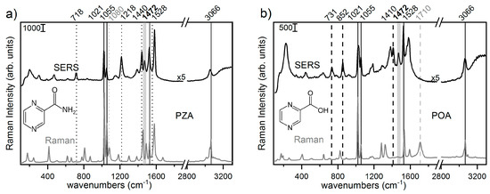 Reference Raman spectra of the powder (gray spectra in the bottom) and surface-enhanced Raman spectroscopy (SERS) spectra (black spectra in the top), applying hydroxyl amine hydrochloride reduced h-AgNPs, of PZA and POA in a concentration of 10−3 M in panel (a) and (b), respectively. Marker bands for both analytes are indicated with black lines, marker band specific for PZA are depicted with doted lines, marker band for POA with dashed lines. For both analytes a scheme of the molecular structure is shown.