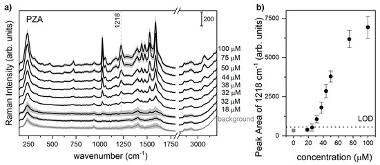 (a) Lab-on-a-chip SERS (LoC-SERS) mean spectra of different concentrated PZA in water as indicated in the plot. The standard deviation values are indicated in grey; (b) the integrated intensity of the marked peak centered at 1218 cm−1.