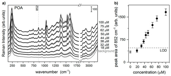 (a) LoC-SERS mean spectra of different concentrated POA in water as indicated in the plot. The standard deviation values are indicated in grey; (b) the integrated intensity of the marked peak centered at 852 cm−1.
