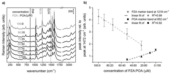 The mayor differences can be noticed in bands located at 852 and 1372 cm−1 characteristic for POA and the vibrational modes centered at 1218 and 1440 cm−1, being marker modes for PZA. These bands are changing in ratio correlated to the individual concentrations of both target molecules. In Figure 5b, the peak intensity of the PZA marker mode at 1218 cm−1 and the POA marker mode at 852 cm−1 are plotted after normalization to the peak at 1472 cm−1. The reference band centered at 1472 cm−1 is caused by N–C stretching [38]. This band is present in the spectra of both analytes (as indicated in Figure 1a,b) with a resembling intensity. Thus, this band is very well suited as a reference band for the normalization. For both analytes a linear signal to concentration dependency could be observed. For PZA the concentration ranged from 20 to 100 μM (with a coefficient of correlation R2 = 0.99) and for POA the range from 50 to 100 μM (with a coefficient of correlation R2 = 0.92) could be determined. Thus, for the concentration PZA/POA 20 μM/80 μM to 50 μM/50 μM to simultaneous detection could be realized as very successful. The detection limits for PZA and POA are 20 μM and 50 μM, respectively.